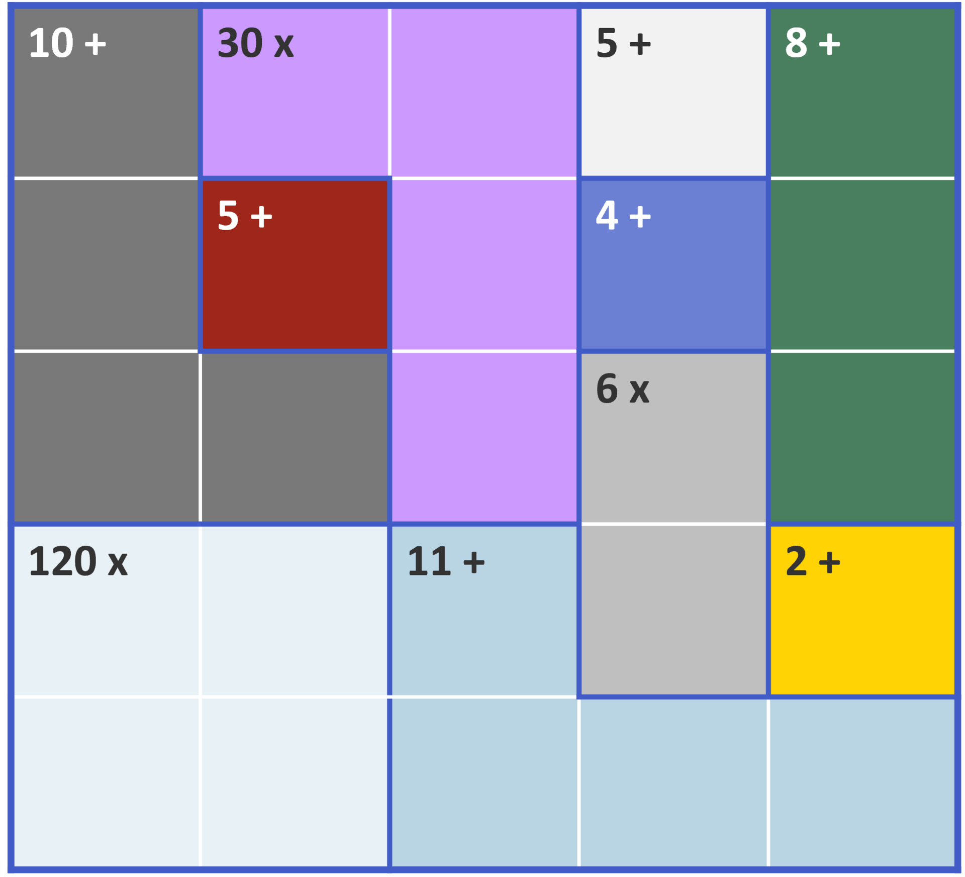 Each bold-outlined group (with same color) must equate the result with the numerical operation - addition (+), subtraction (-), multiplication (*) and division (/)