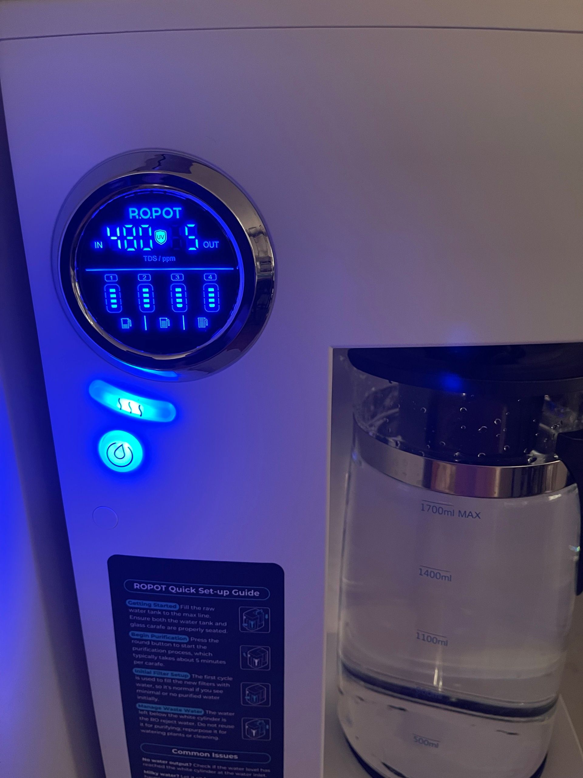Here’s a pic from Max’s reverse osmosis filter - 480 total dissolved solids (TDS) went in and only 5 made it through the filter in the water to drink.