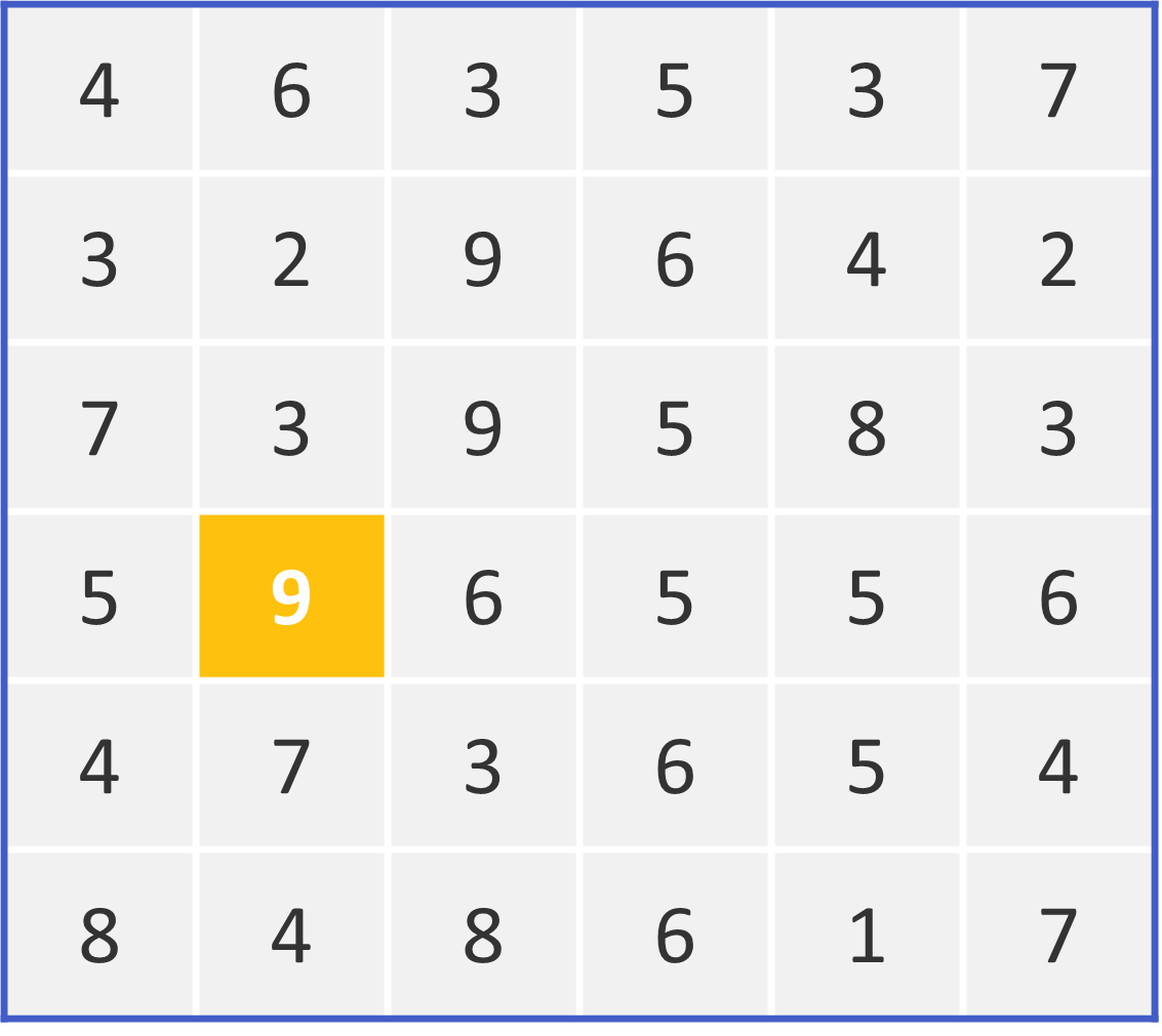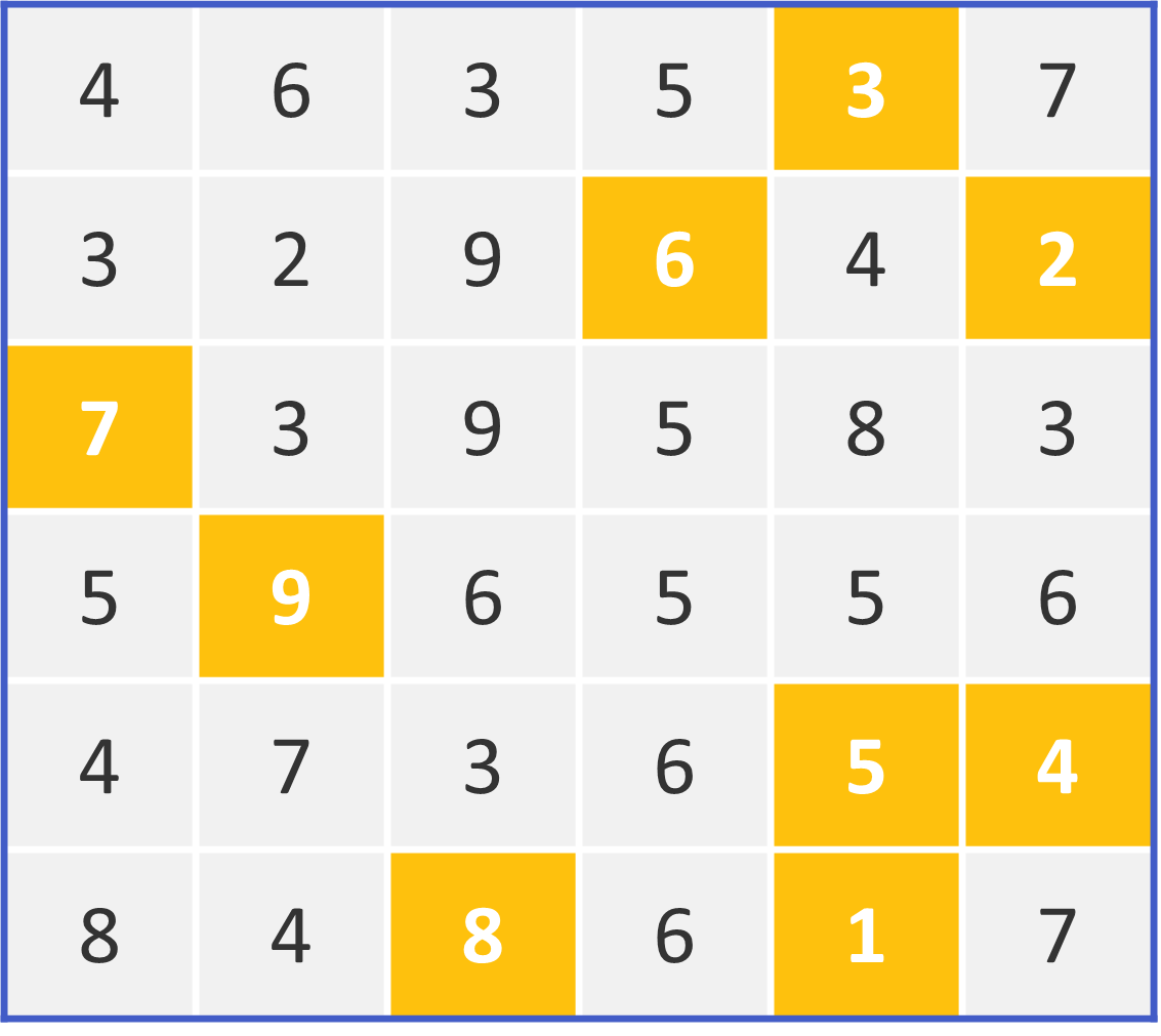 Kyudoku is a 6x6 grid where you need to use logic to find nine unique numbers (1 to 9) so that each row and column has a sum of 9 or less. The 9 highlighted in yellow is given.