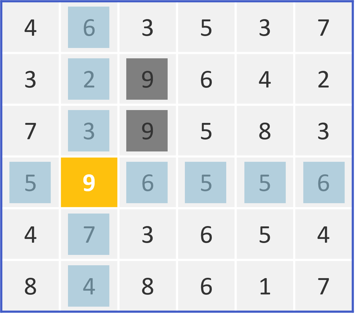 Here’s a little help to get started. Because we know 9 is given, we can’t use 9 again (gray boxes) and we can also eliminate any numbers that would make the sum of the row or column with the given 1 more than 9 (blue boxes). Again, this is a little tougher - good luck!