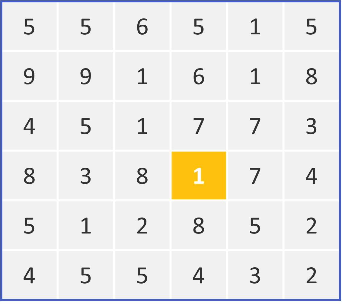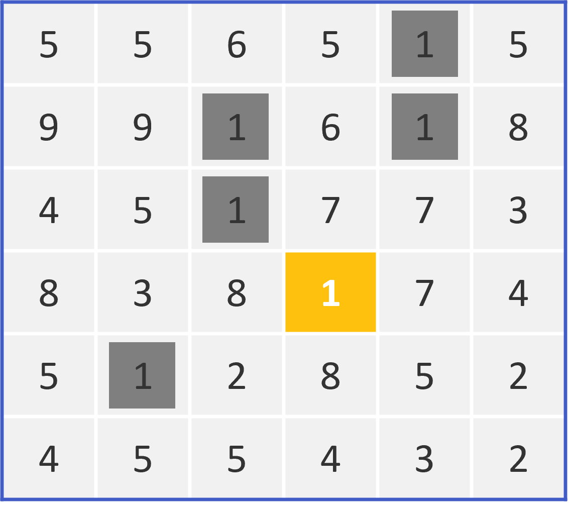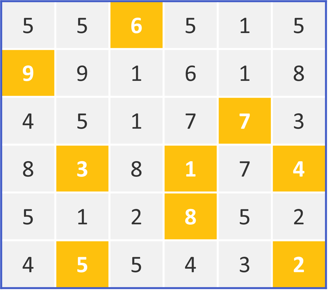Kyudoku is a 6x6 grid where you need to use logic to find nine unique numbers (1 to 9) so that each row and column has a sum of 9 or less. The 9 highlighted in yellow is given.